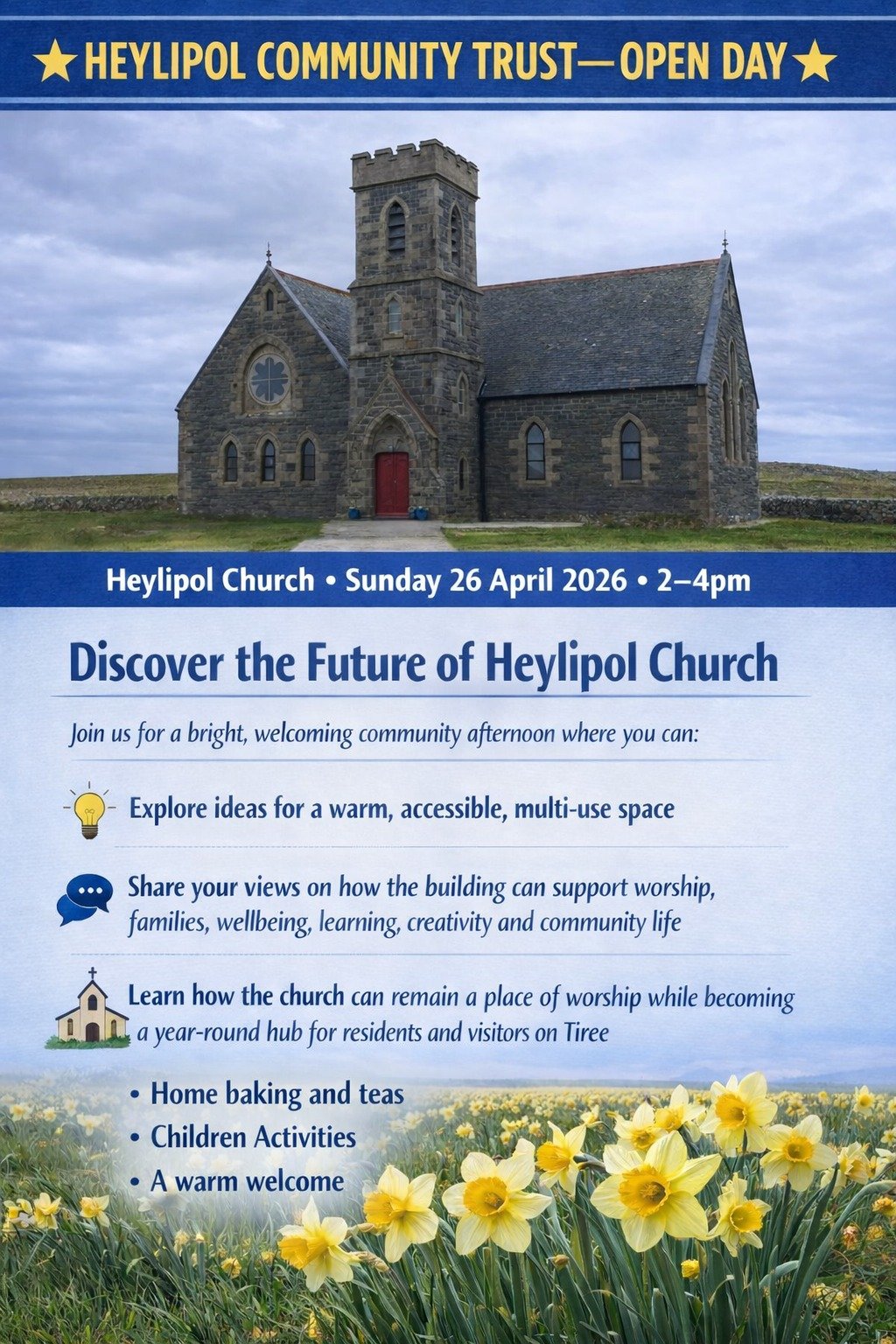 Discover the Future of Heylipol Church 📍 Heylipol Church • Sunday 26 April 2026 • 2–4pm Join us for a bright, welcoming community afternoon where you can: We’ll also have: